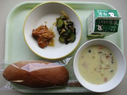 今日の献立は、照り焼きチキン、海藻サラダ、豆ときのこのクリーム煮、ココアコッペパン、牛乳です。