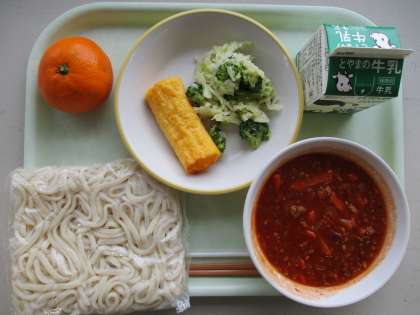 ソフト麺のミートソース、たまごロール、グリーンサラダ、牛乳、みかんです。