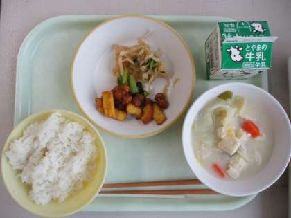 今日の献立は、底なしイ〜カビーンズ、にんじゃジンジャーのお浸し、塩麹鍋、ご飯、牛乳です。