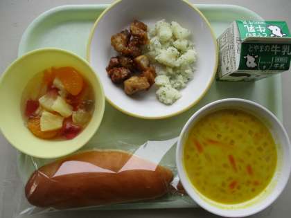 今週は全国学校給食週間です。読んで楽しく、食べておいしいお話をテーマにした内容になっています。今日の献立は、シンデレラの物語をイメージしており、豚肉のハニーマスタードソースかけ、グリーンポテト、シンデレラポタージュ、ガラスのカクテル、コッペパン、牛乳です。
