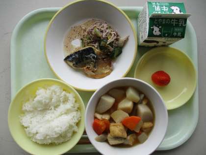 学校給食週間最終日の献立は、男子弁当部の本の世界をイメージしており、さばの塩焼き、えのきの梅肉和え、のっぺい、ご飯、牛乳、いちごです。
