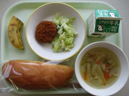 今日の献立は、メンチカツ、ブロッコリーサラダ、白菜スープ、コッペパン、バナナ、牛乳です。