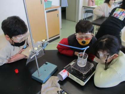 理科の学習で、水を沸騰させると出てくる泡を袋に集める実験を行いました。予想では空気と考えている子供が多かったのですが、集めてみると、袋は膨らまず、どんどんと水滴が集まってくる様子を見て、驚いた子供たちでした。