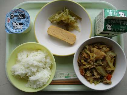 今日の献立は、厚焼き卵、茎わかめの酢のもの、ホイコーロー、ご飯、牛乳、ヨーグルトです