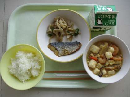 鰆の西京焼き、レンコンのきんぴら、エビと豆腐のうま煮、ご飯、牛乳です。