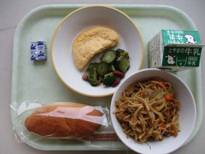 今日の給食は、焼きそば、オムレツ、ビーンズサラダ、ポケットチーズ、コッペパン、牛乳です。