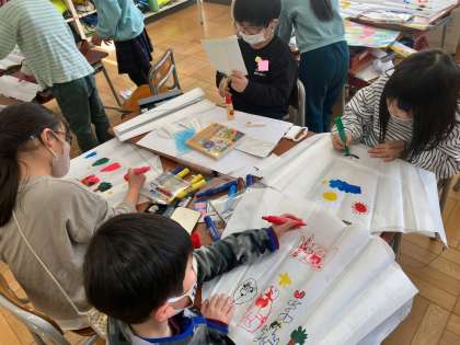 凧に好きな絵を描いて揚げました。晴天のもと、空高く揚がる凧に歓声を上げる子供たちでした。