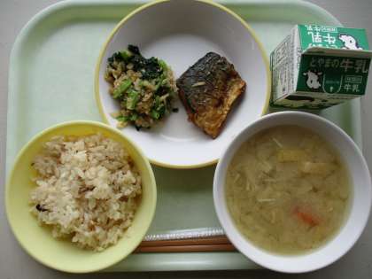 今日の献立は、魚の蒲焼き、はりはり和え、五目ご飯、味噌汁、牛乳です。