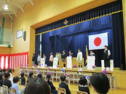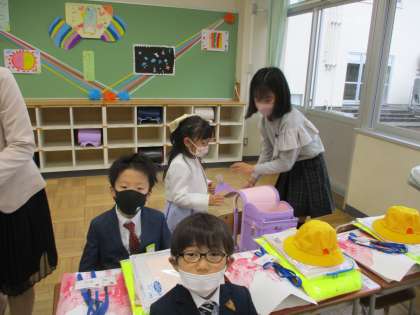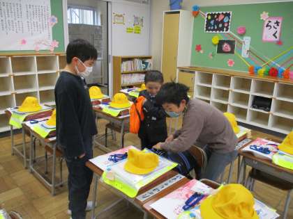 6年生は、入学式の準備に関わりました。受付では、1年生や保護者の方に元気よく挨拶をして各教室に誘導したり、教室では、ランドセルのしまう場所を優しく教えてあげたりするなど、最高学年として立派な態度で活動していました。