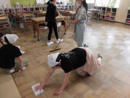 5年生では、掃除の時間に各クラスの担当場所に加えて、「選(えら)ベスト掃除」という新しい分担グループが追加されました。学年目標の「ベストをつくせ!」にちなんで、自分たちで汚れている場所を見つけて掃除に取り組んでいます。廊下のサッシや、本棚の隅など、普段目につかない場所まで一生懸命掃除をしています。