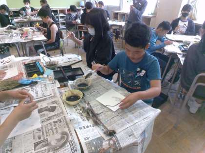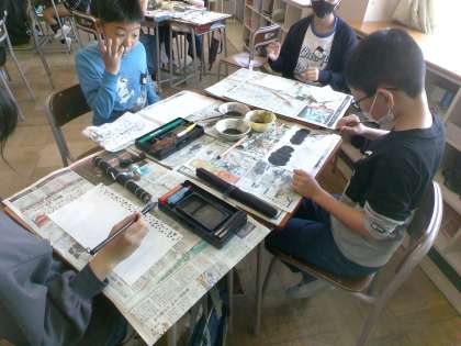 図工の時間では、1人1人が作ったオリジナルの筆を使って、水墨画を描きました。墨の濃淡を生かしたり、にじみやかすれなどの技法を取り入れたりして、楽しみながら作品をつくりました。