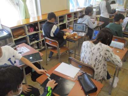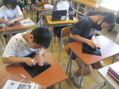 図画工作科で、「けしてかく」に取り組みました。題材が「植物」ということで、身近なところで見付けた花の写真や、好きな植物の写真をインターネットで検索して下書きをかきました。実際に消す作業をしてみると、力加減により白くなる度合いが違ったり、意外と力が必要だったりするため、苦戦する様子も見られましたが、集中して頑張る姿が多く見られました。