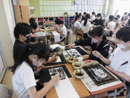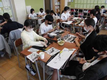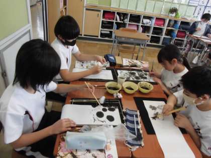 自分で作成した筆を使い、にじみや墨の広がりから、思い思いに描いていました。