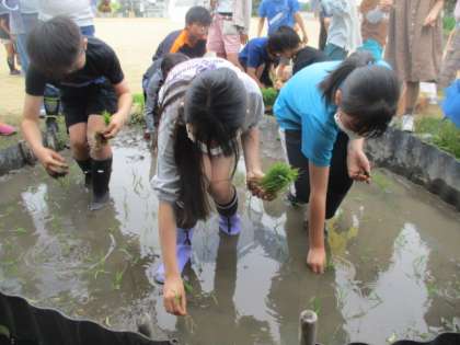 昨年度整備された新庄の森にできた田んぼに、田植えを行いました。各学級の代表が昔ながらの手作業で間隔をとりながらていねいに稲の苗を植えました。「どのくらいの米ができるかなぁ」と今後の生長を楽しみにしている子供たちでした。
