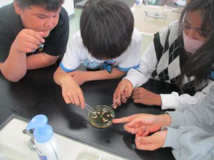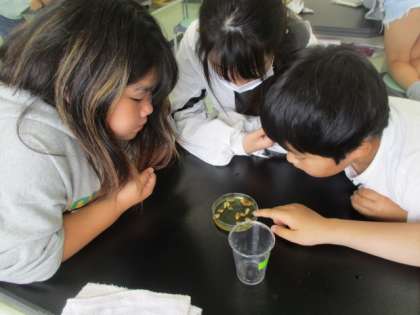 理科の学習で、発芽に使われているでんぷんが、種子にふくまれているか、そして発芽後の子葉にはふくまれているかの実験をしました。時間が経つにつれ、だんだんと青紫色に変化していく種子を見て、色の変化のおもしろさと同時に、でんぷんの存在を目で確認できるおもしろさも感じている子供たちでした。