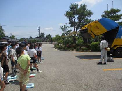 3R(リサイクルやリユース)について教えていただいたり、ごみ収集車を見学したりしました。
