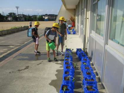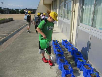 理科の学習で育てている植物が大きくなってきたので、鉢に植え替えました。当番の子供たちが丁寧に水やりをしています。
