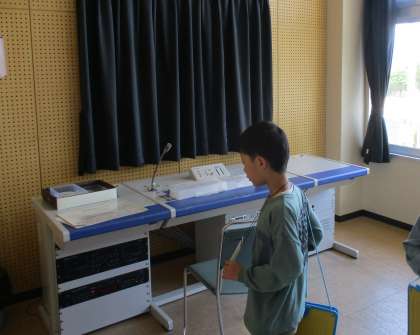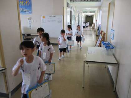 1年生は、学校中を探検して回り、どんな部屋があるのか、どんな物があるのか発見しています。放送室や理科の設備に感動したり、「大工さんみたいな人がおられる!花のお世話をしているよ、名前を聞いてきたいな」とインタビューに行ったりしています。また、学校にいる人ともなかよくなろうと先生たちにも声をかけてサインをもらっています。探検楽しみ!と嬉しそうに出かけていきます。