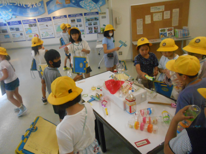 富山市エコタウンにある工場で行われているリサイクルに関する取組のパネルや、実際にリサイクルをして作られた遊び道具に触れていました。