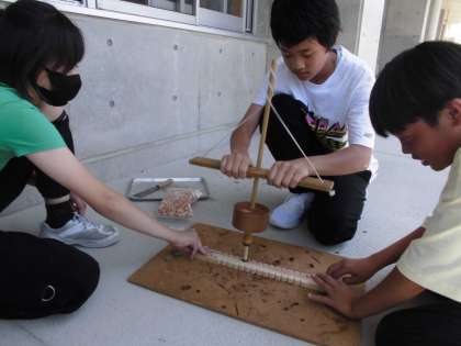 火起こし体験の様子です。おもうように火が付けられず苦戦している子供もいましたが、煙の様子をじっくり観察しながら、友達と協力して火起こしができました。