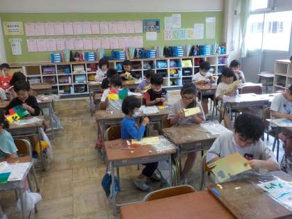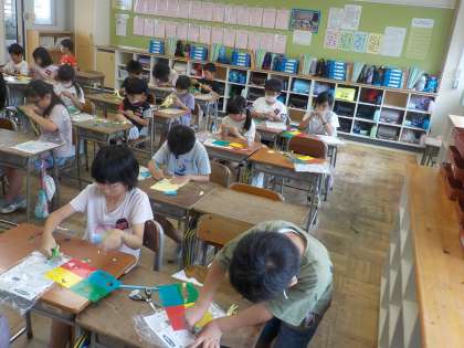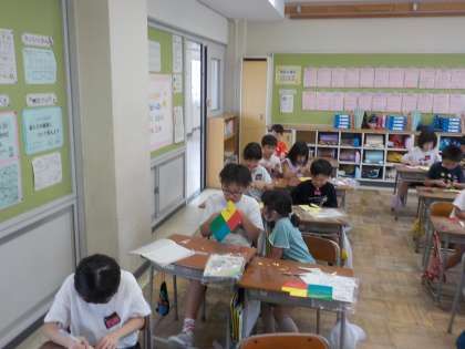 図画工作の時間では、透明なうちわに様々な形や色のシールを貼り、オリジナルのうちわをつくりました。子供たちは、光に当てながら、見えた様子を友達と見せ合ったりして楽しく活動していました。