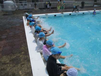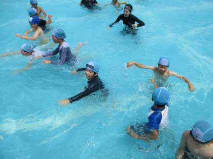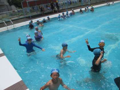 プール掃除とプール除草を頑張った6年生と5年生が、プール開き当日に早速プールに入りました。きらきらの笑顔で、久しぶりのプールを楽しんでいました。