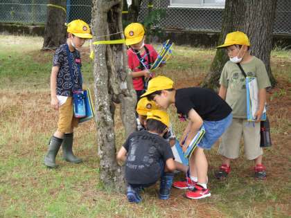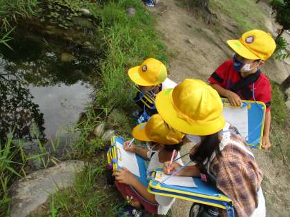 新庄の森を探検した子供たち。ツツジの花やシオカラトンボ等、いろいろな生き物と出会いました。今日は、見つけたものの様子を詳しくメモに書きとめました。