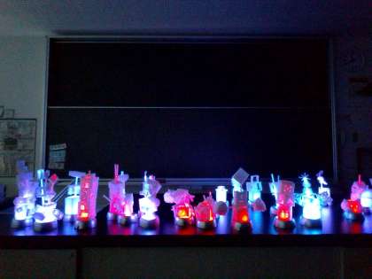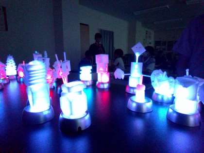 暗い部屋に輝く作品を見て、子供たちは感動していました。