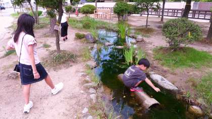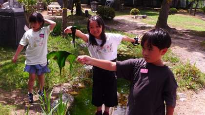 自然に生息したアオミドロをすくって、「大物だ!!」と喜んでいます。