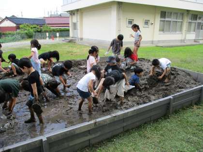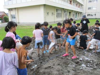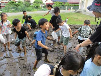 どろんこパークでどろんこ遊びをしました。泥の中にこわごわ入っていった子供たち。楽しそうにお団子を作ったり、どろんこ滑り台をしたりしました。