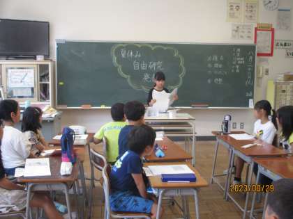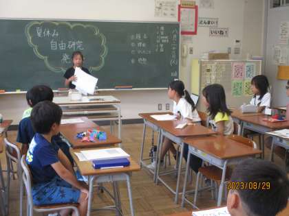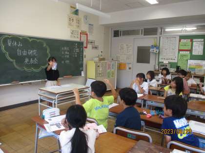 夏休みに頑張った自由研究について発表会をしました。最後まで頑張りきった努力の証が光っていました。