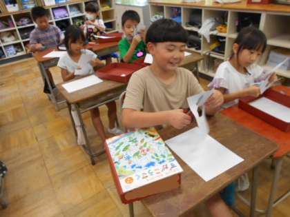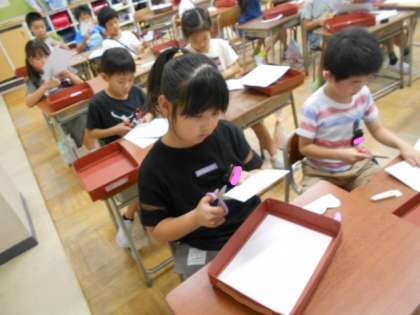 図画工作科では、はさみを自由自在に動かし、偶然できた形を生かして作品を作ります。子供たちは、紙をギザギザ・なみなみ・丸などいろいろな形に切っていました。隣の友達と切った形が何に見えるか話し合ったりしながら楽しんで取り組んでいました。