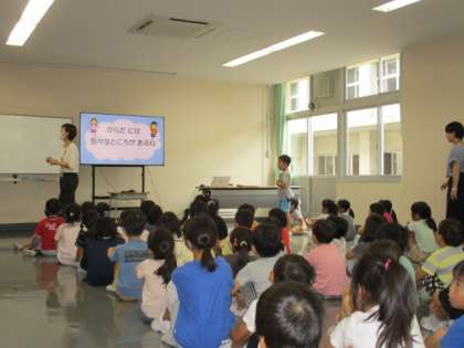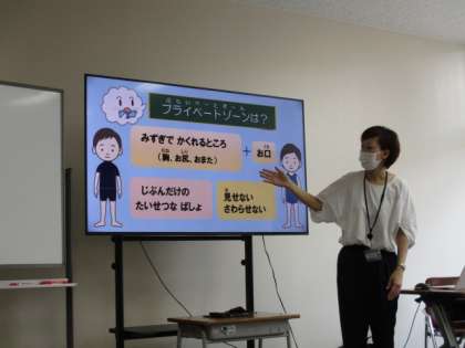 子供たちは、動画を見たり、クイズに挑戦したりして、水着を着ると隠れる体の部分を「プライベートゾーン」と言い、他人に簡単に見せたり触らせたりしてはいけないところだと学びました。