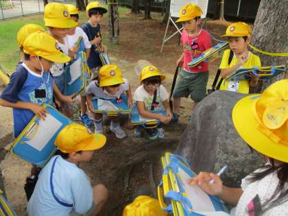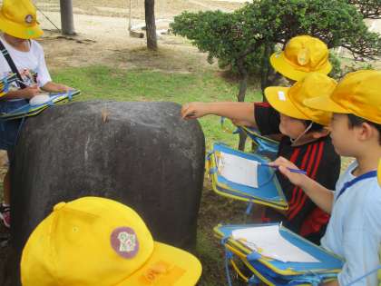 生活科「生きものと友だち」の学習で、新庄の森へ生き物探しに出かけました。ちょうど大きなショウリョウバッタと出会い、子供たちは興味津々でした。シオカラトンボやアゲハチョウ、アリ、ダンゴムシ等、いろいろな生き物の様子をじっくりと観察しました。
