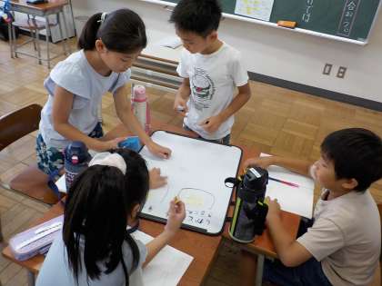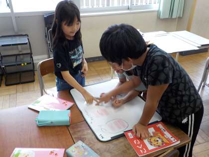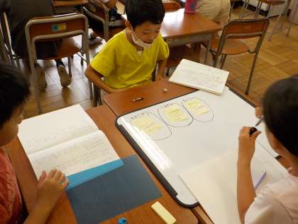 「こんな遊びをみんなでしたら楽しいと思うな」「夜は星を眺めようよ」「大好きなペットも連れて行きたいけど…」など、グループ毎に意見を出し合いました。