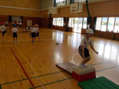 今日の体育で跳び箱学習を行いました。跳び箱を楽しみにしていた子供たちは、怪我に気を付けながら、様々なコースの跳び箱に取り組みました。手の使い方や跳び方など、上手になりたいという気持ちがすごく伝わってきました。