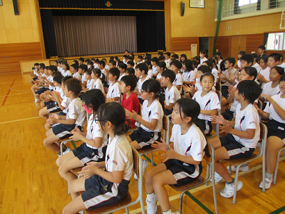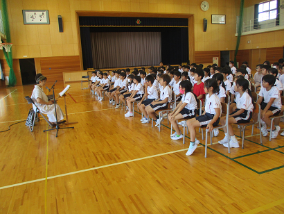3限の時間に、鈴木優子先生をお招きして、お話や詩の朗読を聞かせていただきました。これまでの学習の中で出てきたお話や、リズムに乗って復唱した和歌等、聴くときは聴き、楽しむときは楽しみながら過ごしていました。