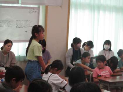 人や物に「役立つ」とはどういうことか、研究を続ける子供たちは今回の話合いで「挨拶」をテーマに話し合いました。「工夫をし続けているのがすごい」「そもそも挨拶は役に立つのか」「自分が得意で好きなことを続けているのがいいな」など、それぞれに思いを膨らませている子供たちです。
