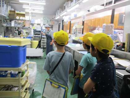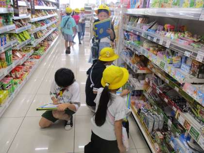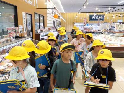 大阪屋ショップ新庄店でスーパーマーケットの店員さんの工夫について学んできました。お店の中の気になるところや気付いたことに好奇心いっぱいの子供たちの姿です。