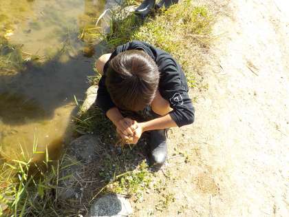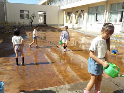 「1年生の中庭をきれいにするぞ」と水をまいて掃除をする子供、「お客さんが来たときに気持ちよく学校に入ってほしいから」と玄関掃除をする子供、「新庄の森にいたドジョウがいなくなった!どうしてだろう」と環境を気にしている子供など、それぞれが自分の思う「役立ち」に向かって活動に取り組みました。