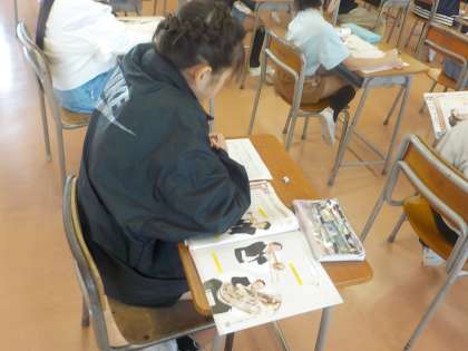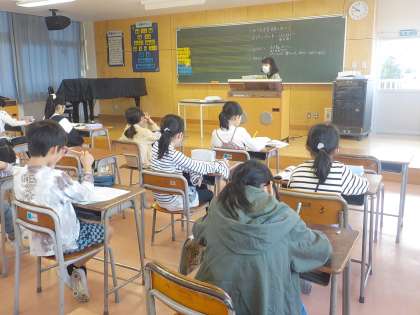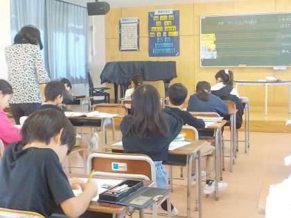 いつもは元気に歌ったり一生懸命リコーダーを吹いたりする子供たちですが、今日はじっくりと鑑賞の時間を過ごしました。トランペットやトロンボーン、チューバなどの管楽器の音を聞き、それぞれの楽器の音を味わいました。「トランペットが走っているみたいだね」「映画で聞こえる音楽みたいだ」それぞれが感じたことをつぶやき、ワークシートに記しました。