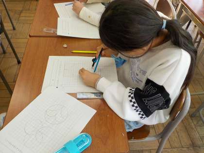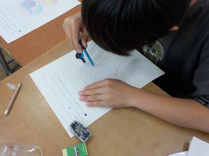 少しずつ使い方に慣れていき、自在に円を描く子やオリジナルの模様を創り描く子、一つの円を丁寧に描く子など、同じ一つの道具を使っても、一人一人の個性があふれ出る子供たちです。