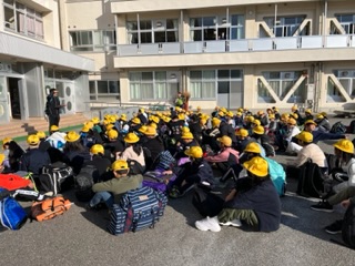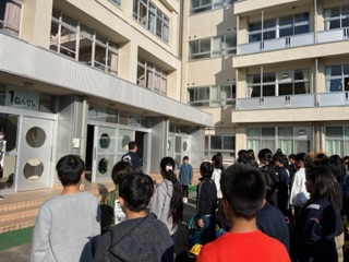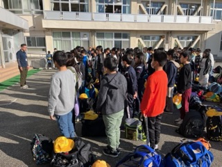 5年生宿泊学習、出発式です。いよいよ富山市子どもの村に向けて出発です。とてもよい天気になりました。みんな元気いっぱいです。行ってきます!