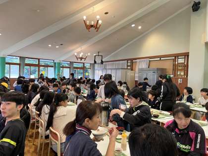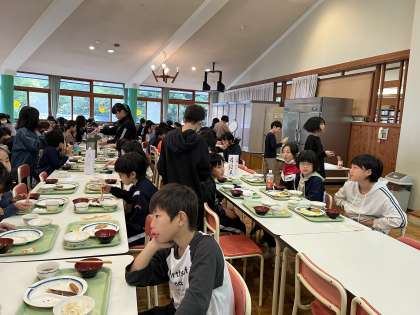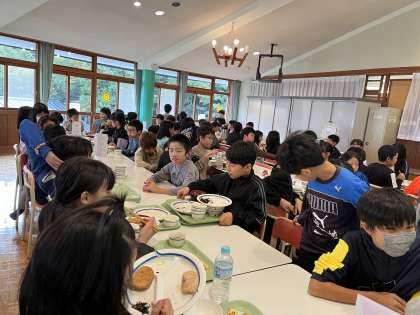 宿泊学習2日目、またよい天気に恵まれ、子供たちは元気に起床。荷物整理やシーツの片付け、掃除、短い時間で一生懸命取り組みました。朝ご飯もたくさんいただきました。みんな元気いっぱいです。今日のメインの活動、村内ビンゴオリエンテーリングが楽しみな子供たちです。