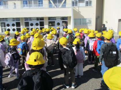生活科「あきをたのしもう」で、どんぐりやまつぼっくり落ち葉拾いに行ってきました。出発前に「どんぐりむらのほんやさん」という絵本の紹介をしました。どんなどんぐりを見つけられるか楽しみにしながら、校長先生に挨拶をして出発しました。