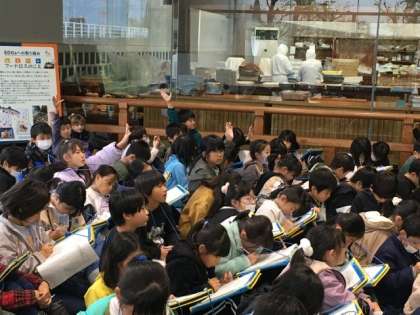 「1日にますのすしを何個つくっていますか?」など、積極的にたくさんの質問をし、熱心にメモを取っています。