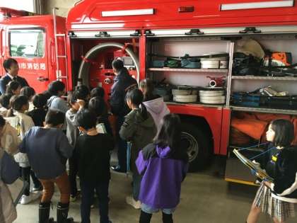 通信司令室と消防車について説明をしていただきました。通信司令室には、富山市と立山町からの119通報は、全てここに集まります。消防車には、火を消すため人を助けるための設備がたくさんあります。とても有意義な見学でした。