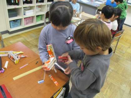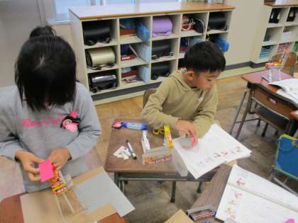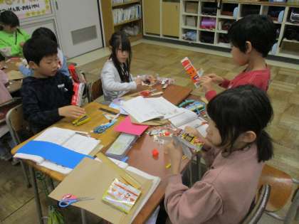 国語科では、作り方が書かれた説明文を読んで、馬のおもちゃを作る学習を行っています。箱を何センチメートルに切るのか、どの部分をつなぎ合わせるのか等、子供たちは文章をしっかりと読み取り、馬のおもちゃを完成させていました。