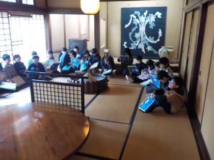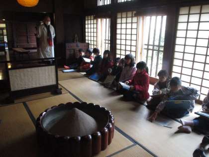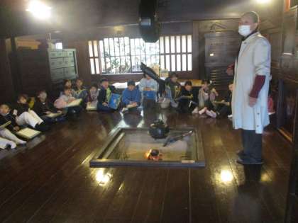 本物のいろりを囲んで、子供たちは五感を通して昔の家のつくりや生活の一部を体験しました。