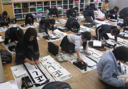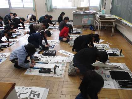 3年生は初めて毛筆での書き初めを行います。今日は初めて「正しい心」の四文字を練習しました。一文字一文字真剣に練習していた子供たちです。
